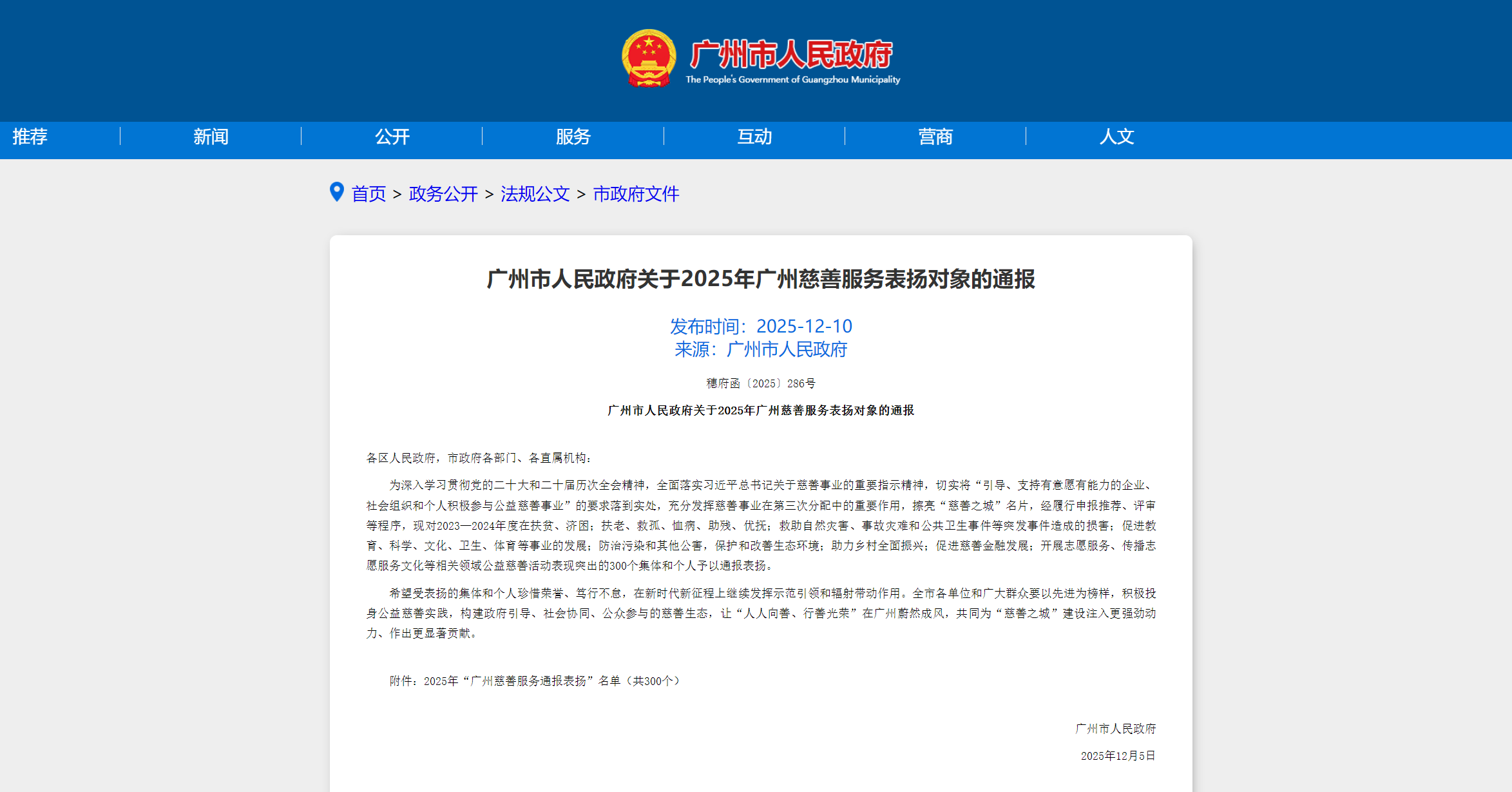 近日,广州市人民政府发布《关于2025年广州慈善服务表扬对象的通报》,对2023-2024年度全市慈善服务领域表现突出的300个集体与个人予以通报表扬。其中,大参林医药集团入选企业表扬名单。
